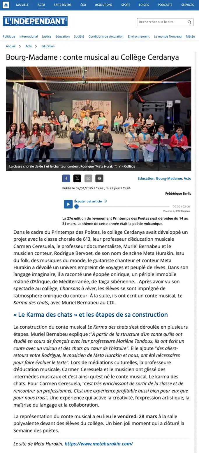 Après avoir assisté au spectacle « Chanson à rêver », les élèves ont à leur tour imaginé un Conte Musical qu’ils ont mis en forme avec l’aide de l’artiste. Pour ce faire, Meta Hurakin a également écrit cinq chansons que les élèves ont travaillées et qu’ils ont inséré dans le spectacle. Après plusieurs sessions de travail ils ont enfin présenté leur spectacle à tous les élèves du Collège. Intitulé « Le Karma des Chats », le conte qu’ils ont créé est une pépite de poésie et d’humour !